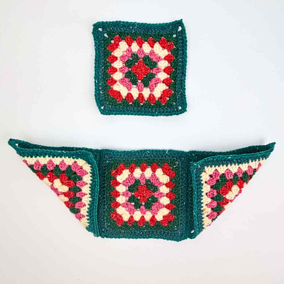 This festive boho-style bum bag is the final project in the Stash to Sparkle CAL Blog Hop (see below for blog hop details). First you make four crochet granny squares, then you join them together in a clever way to form a crescent-shaped bag.