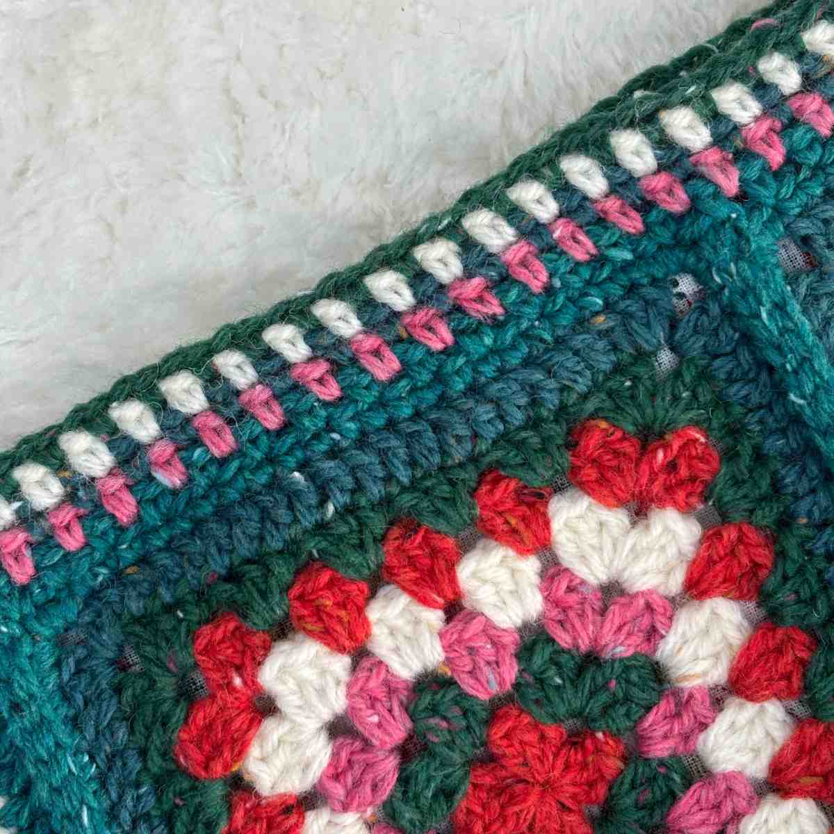 Edging Round: Join edging colour with slst to any corner. Ch1 (does not count as a st), [2dc, ch2, 2dc] in same corner sp, 1dc in every tr to next corner, *[2dc, ch2, 2dc] in next corner sp, 1dc in every tr to next corner; repeat from * twice more, slst in first st, then fasten off. (26 dc along each side, 4 x corner ch2-sps). Weave in all ends on wrong side of work.