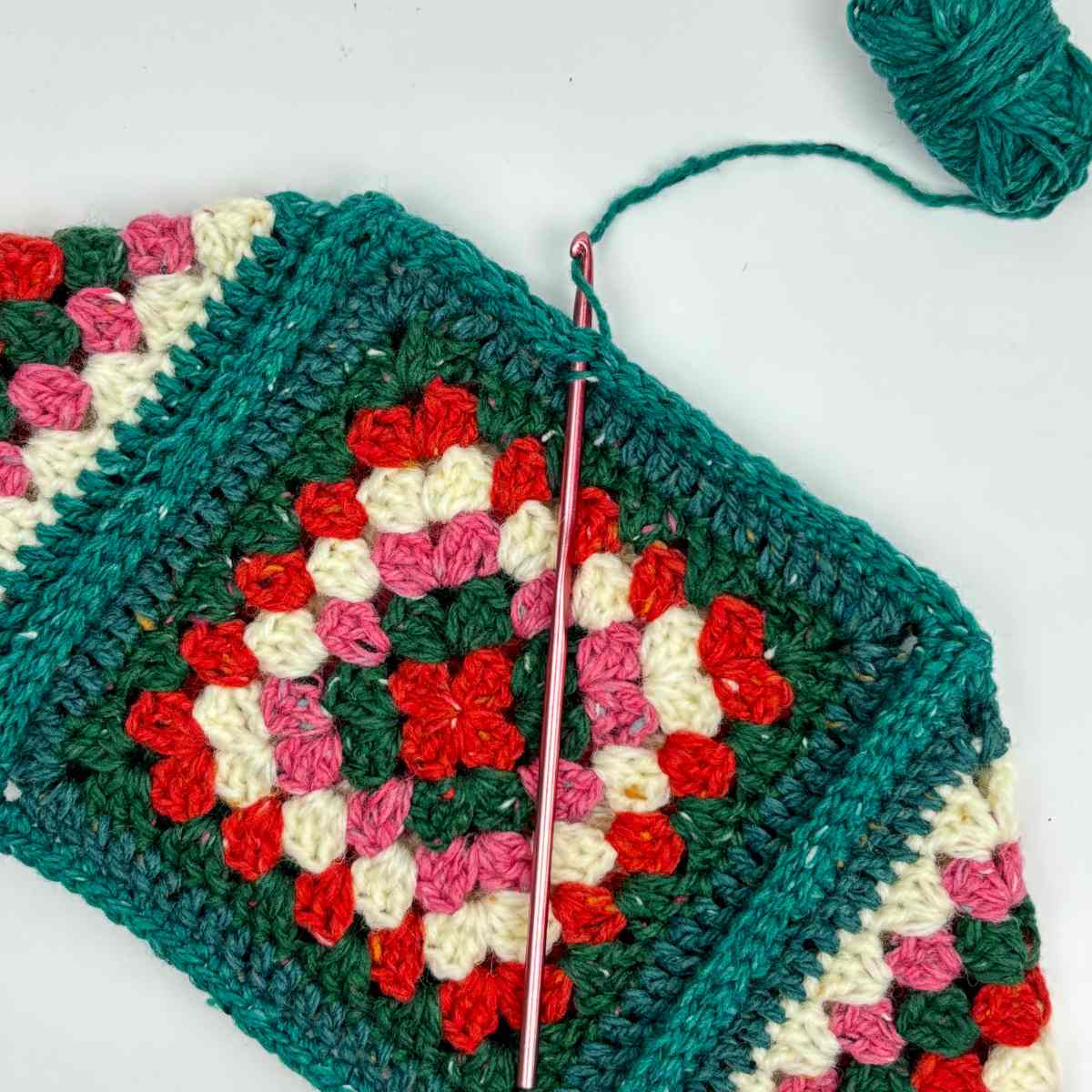 Round 7: Join next colour with slst to any corner. Ch3 (counts as 1dc), [1dc, ch2, 2dc] in same corner sp, 1dc in every dc to next corner, *[2dc, ch2, 2dc] in next corner sp, 1dc in every dc to next corner; repeat from * twice more, slst in third ch of beginning ch3, then fasten off. (22 dc along each side, 4 x corner ch2-sps)