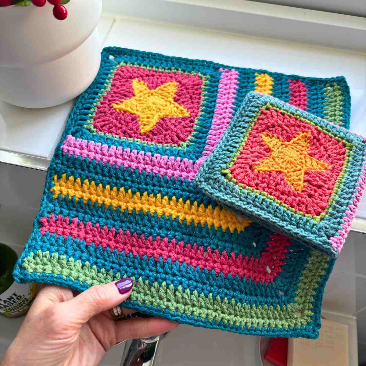 - Approximately 26 x 26cm (10.25 x 10.25in) using Scheepjes Cahlista and 4.5mm (US 7) hook.