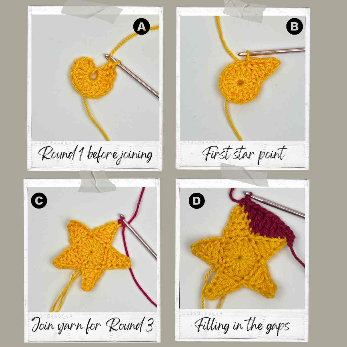 Round 2: [Ch5, skip 1 ch (counts a ch1-sp), 1sc in second chain from hook, 1hdc in next ch, 1dc in next ch, 1tr in next ch, skip next 2 dc along Round 1, slst in next st] 5 times, then slst into base of first ch5. Fasten off Yellow (5 star points) – see image B below showing first point.