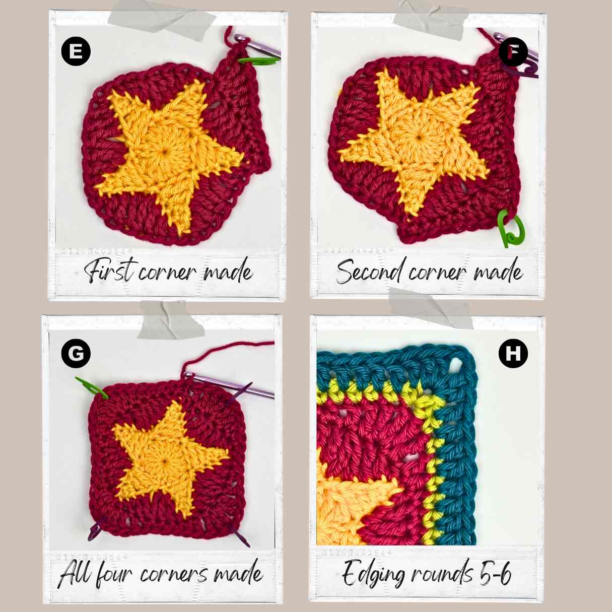 Round 4: Ch1, 1hdc in same st, *1sc in next 3 sts, 1hdc in next st, 1dc in next st, 1tr in next st, 3tr in next st for corner, 1tr in next st, 1dc in next st, 1hdc in next st; repeat from * 3 times more, omitting final hdc. Slst in first st, then fasten off. (48 sts) – see images E, F and G below.