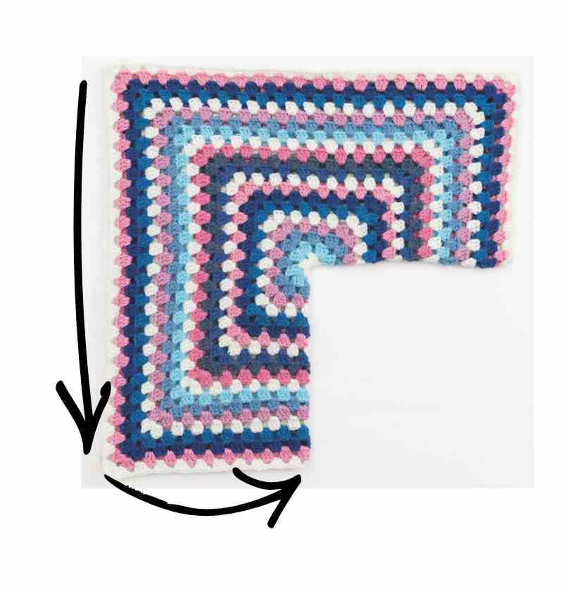 Rounds 2–4 (6, 6, 8, 8, 12): Rep Round 1 a further 3 (5, 5, 7, 7, 11) times, maintaining colour sequence.