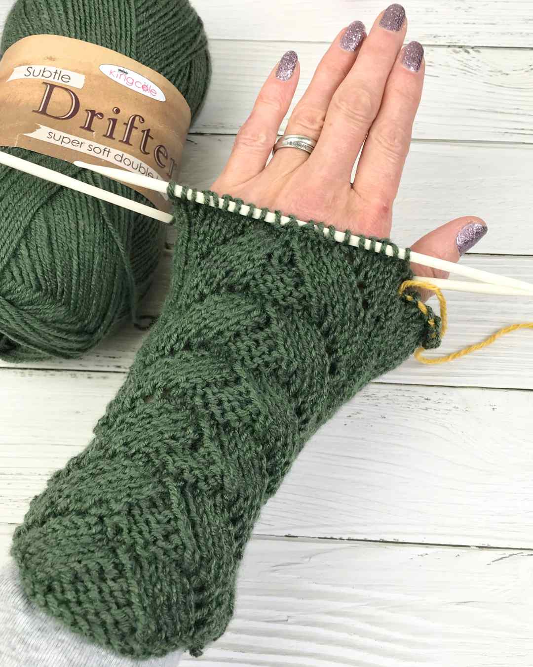 - I used King Cole Subtle Drifter DK (22% cotton, 6% wool, 69% acrylic); 100g/300m in shades 4396 (Conifer) for regular length mittens and 4395 (Mustard) for longer length.